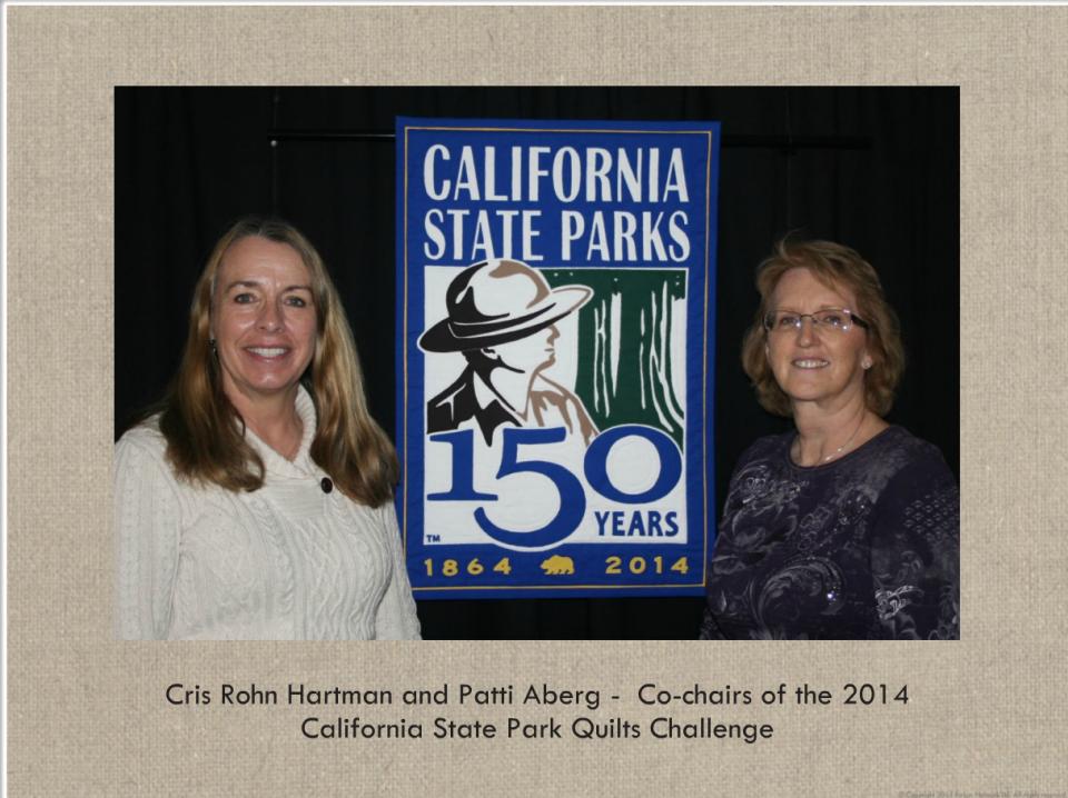 Cris Rohn Hartman (challenge co-coordinator) has sent us a wonderful Smilebox of the California State Park Quilts - 2014 challenge. To commemorate the 150th anniversary of the California State Parks in 2014, a "challenge" was issued to guild members of the Redding Quilt Guild (The Quilters' Sew-Ciety of Redding, Inc.), to create a quilt depicting a California State Park. The special exhibit titled "Celebrating California's State Parks" consists of 57 quilts made by 57 quilters to celebrate and showcase the diversity and beauty of the 278 various state park units in the state.