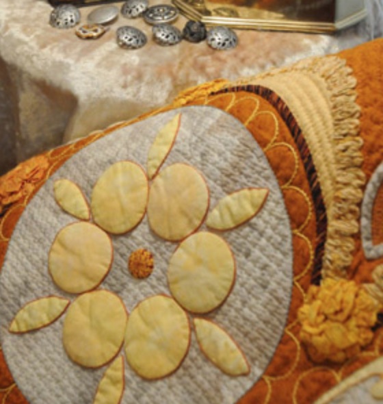 J: There are different scales of crosshatching, wider in the wide-open cheddar areas and tighter in the circles. This really adds a rhythm to the quilting. Do you mark the smaller areas in the same way?