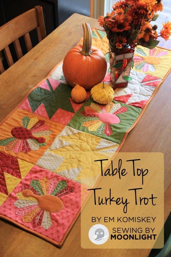 Here's a cute table runner pattern from Em Komiskey at the Moda Bake Shop. It features maple leaves and turkeys, and you don't need much more than a layer cake, fusible web, embroidery floss and the 3 Bs: backing, batting and binding.