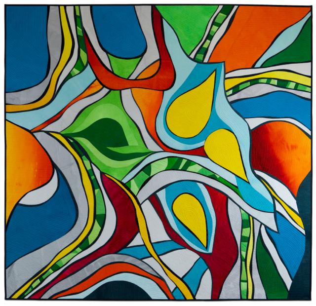 After channeling her artistic muse to painting, jewelry making and architectural photography for many years, Sheila Frampton Cooper plunged into abstract quiltmaking in 2010. Guided by “no plan, no sketch and no agenda,” but fed by intuition and inspired by nature’s palette, she speeds into journeys of revelation and surprise in her quilt studio. Her fully alive intensity is apparent in the colors, lines and shapes of her improvisational textile works.