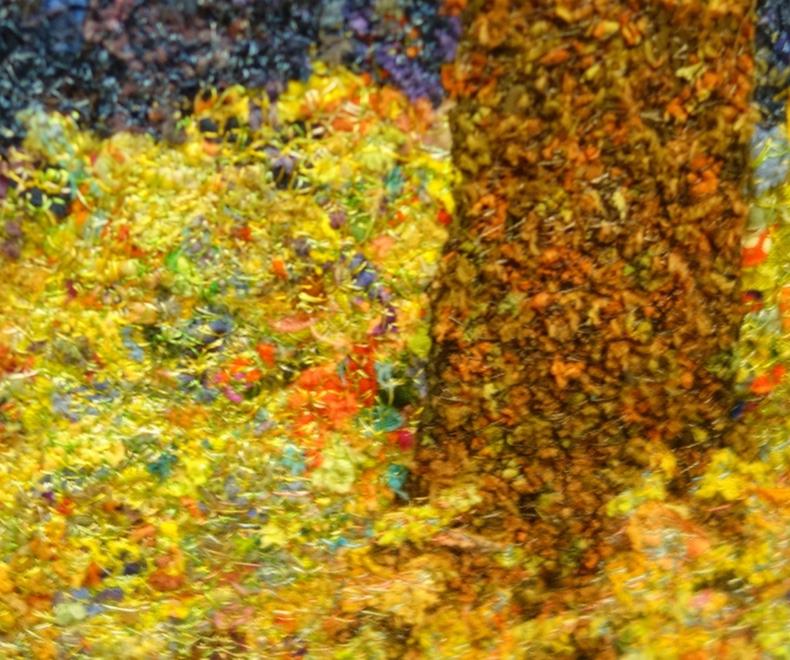 This quilt was made from small pieces fabrics left over from previous projects and then sorted by color and then cut with rotary cutter and scissors into very small pieces. It is then sewed to a background using a free motion zig zag stitch. No netting or fusing is involved. The process is very time consuming but addicting.