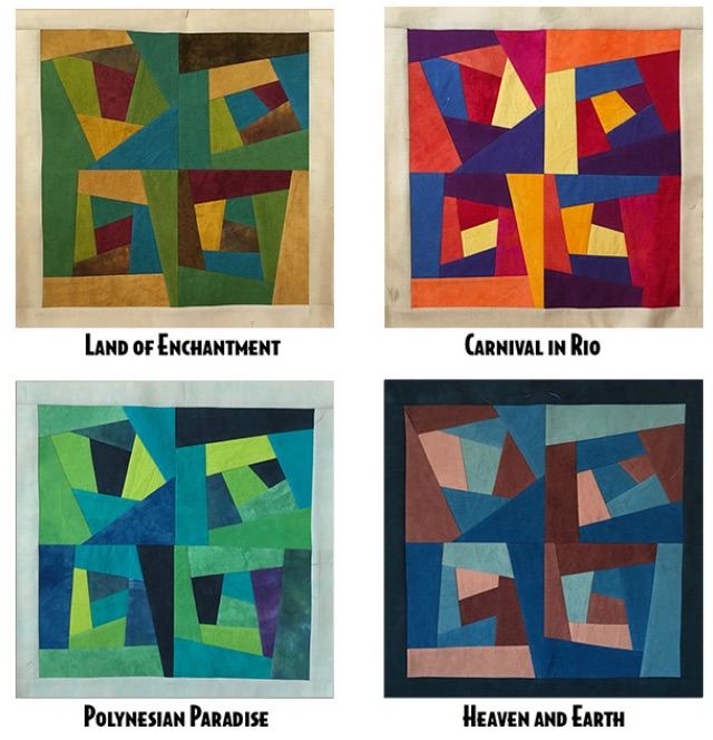 Here is the Crazy Patch block in the four Blendables colorways. Each Blendables pack has six hand-dyed fat quarters. Each colorway is comprised of two coordinating Blendables packs (twelve fat quaters total) and a coordinating one-yard piece of background fabric.