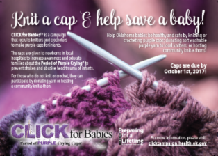 The goal of the Oklahoma campaign is to create awareness of the Period of PURPLE Crying to prevent Shaken Baby Syndrome. The Click campaign involves recruiting knitters to make purple colored baby caps. The caps are collected and then distributed to birthing hospitals and public health units where they are distributed to families with their copy of the PURPLE program through the months of November and December.