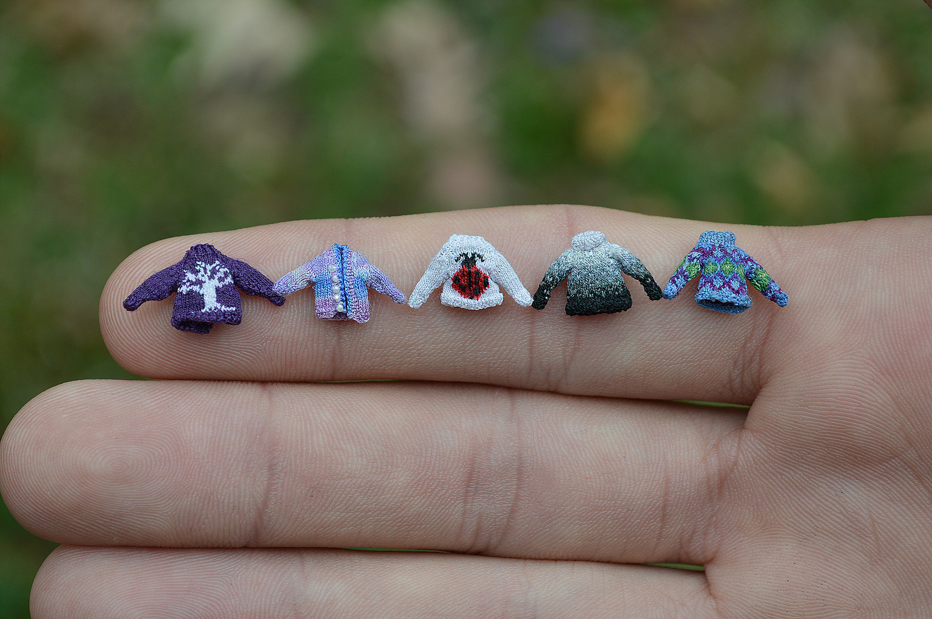Bloomington, Indiana-based Althea Crome has pioneered knitting at a 1:12 scale. She holds the title of fellow at the International Guild of Miniature Artisans (IGMA), and her process of creating extreme knitting requires an incredible level of precision and skill. She makes her own wire knitting needles, which have a diameter of .01 inches, and uses a fine, silk sewing thread, rather than yarn, to achieve the tiny stitches that compose her works. Her needles can accommodate up to 80 stitches per inch. Taken to the silver screen, her miniature knit garments adorn the lead character of the 2009 stop-motion film, Coraline. She designs her own knitting patterns as well as adapts traditional patterns.