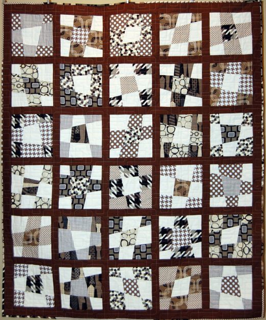 Heather Kojan has come up with a Wonky Nine Patch Quilt that takes no time at all. All you need are some fat quarters, some background fabric, and some sashing and you are on your way.