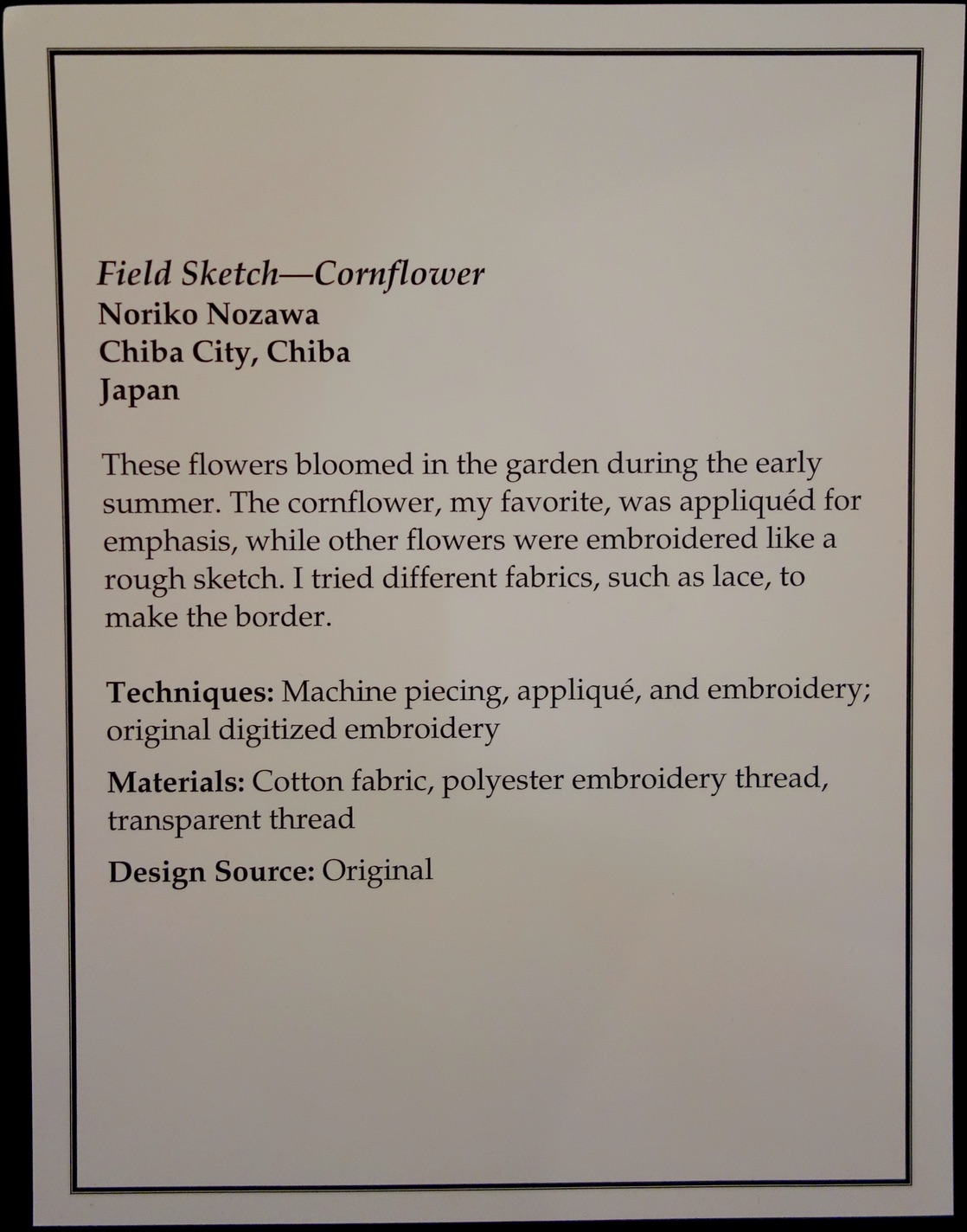 Noriko Nozawa's quilt, Field Sketch-Cornflower, almost looks like a tapestry with her use of appliqué, embroidery, and unique fabrics. Her use of digitized embroidery will make you wonder how she did it.