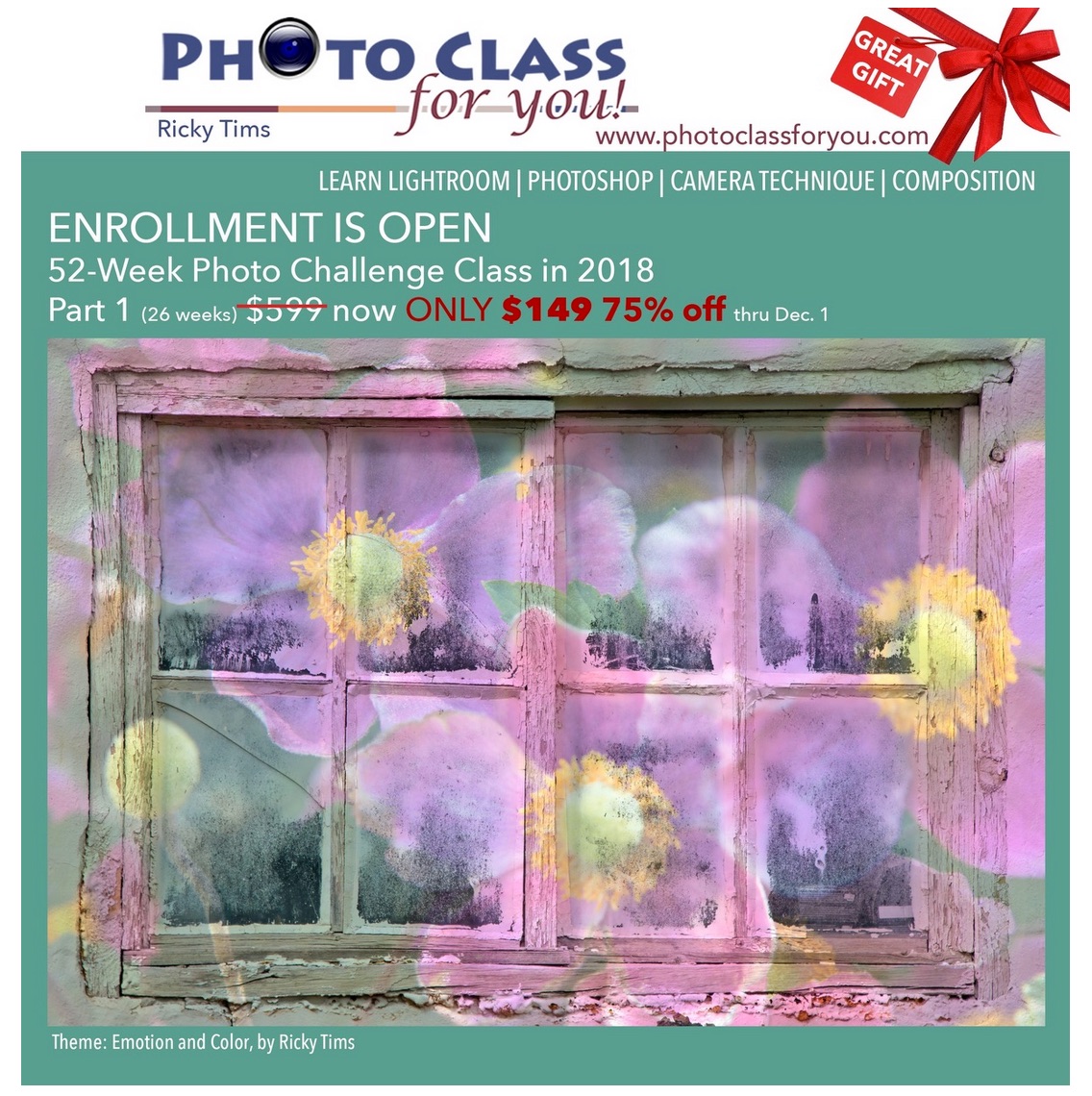 Calling young and old, quilters and non-quilters, beginners and experienced photographers, to join Ricky for his 2018 52-Week Photography Challenge classes. Early enrollment gets you prepared for January. There is a Get Ready For Class lesson instantly, and a late December challenge to help dip your toe in the water. And wouldn't it make a great holiday gift?