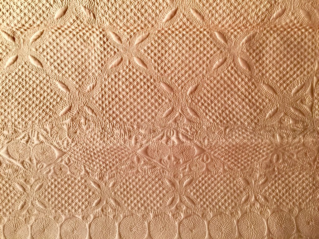 All but one of the quilts on display were whole cloth quilts and most were stitched as part of an initiative by the Rural Industries Bureau of Wales in the late 1920s through 1939.