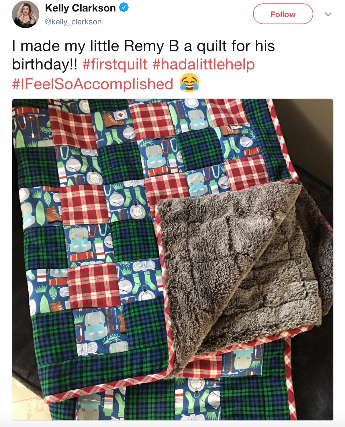 A beloved American Idol winner recently celebrated her 36th birthday with a quilting-themed cake from the Big Sugar Bakeshop. She also completed her first quilt for her child's birthday. Did you guess who it was? It's Kelly Clarkson!