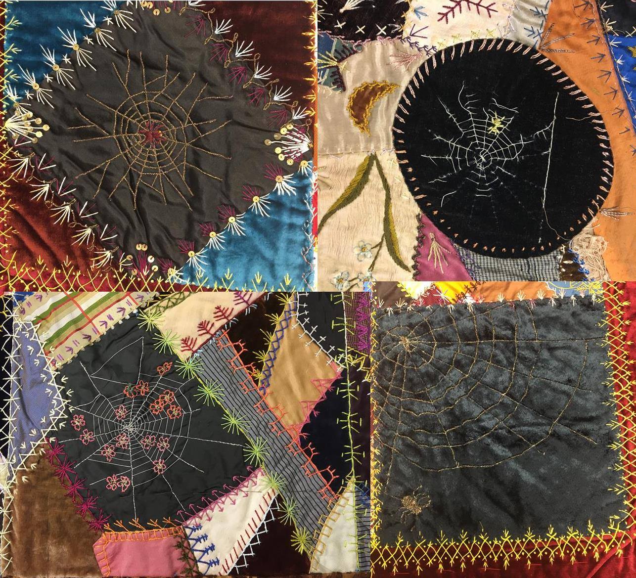 Take a look at four examples from three of their crazy quilts made in the 1880s and 1890s. One uses metallic thread to cleverly evoke the sparkling effect of a web caught in a shaft of light, even though they're all on dark grounds suggesting the night.
