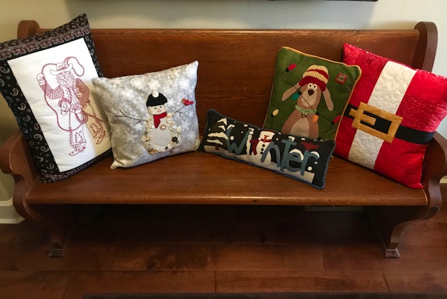 This photo is of pillows that were gifted to me, except for the Buttermilk Basin Winter pattern...I made that one! I like the variety of techniques and there is nothing sweeter than a pillow to bring a smile to the face of family and friends!