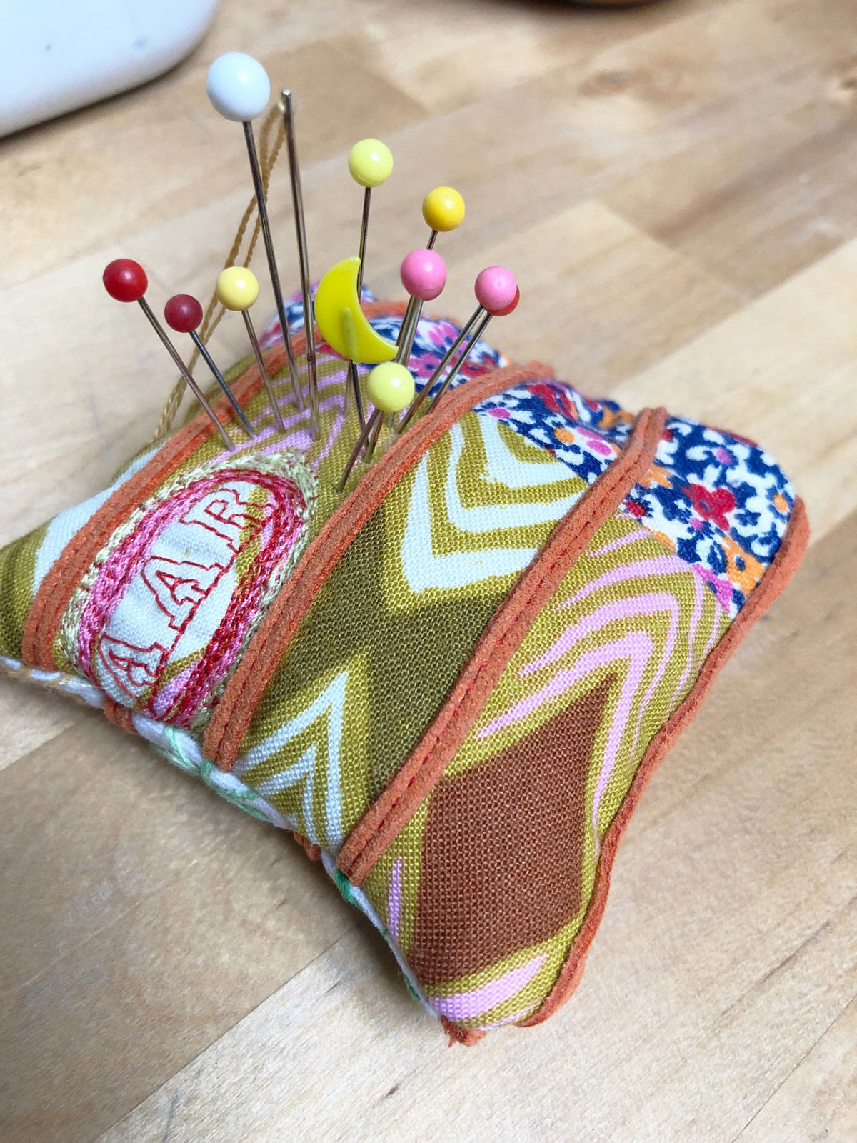 This friendly little pincushion by Rebecca Ringquist makes use of scraps and creates a quick and easy gift for you or a fellow quilter. From start to finish, it takes no more than 45 minutes. While the tutorial has you personalize by machine, you could easily hand embroider the monogram as well.