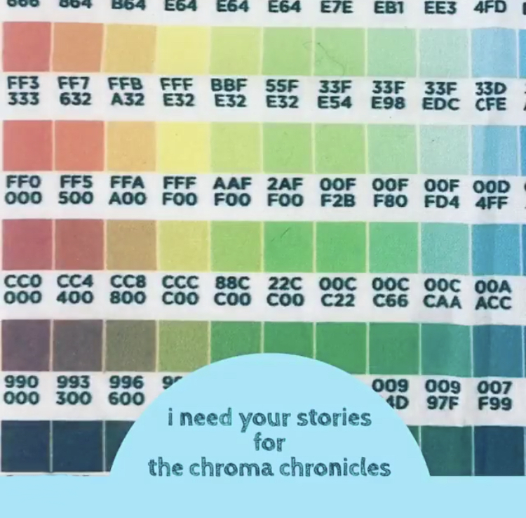 It can be anything from a very significant, formative memory, to something simple where the color is prominent in your mind. Quilts will be made from these stories and colors. You can also visit the blog, The Chroma Chronicles, to see Lisa document the progress of the project.