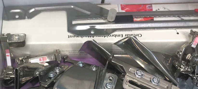 The divided spaces in them are perfect for holding individual pressure feet and I use the small adhesive paper labels on the top of the lid over each one with the foot number on it. Each side holds at least 20 pressure feet.