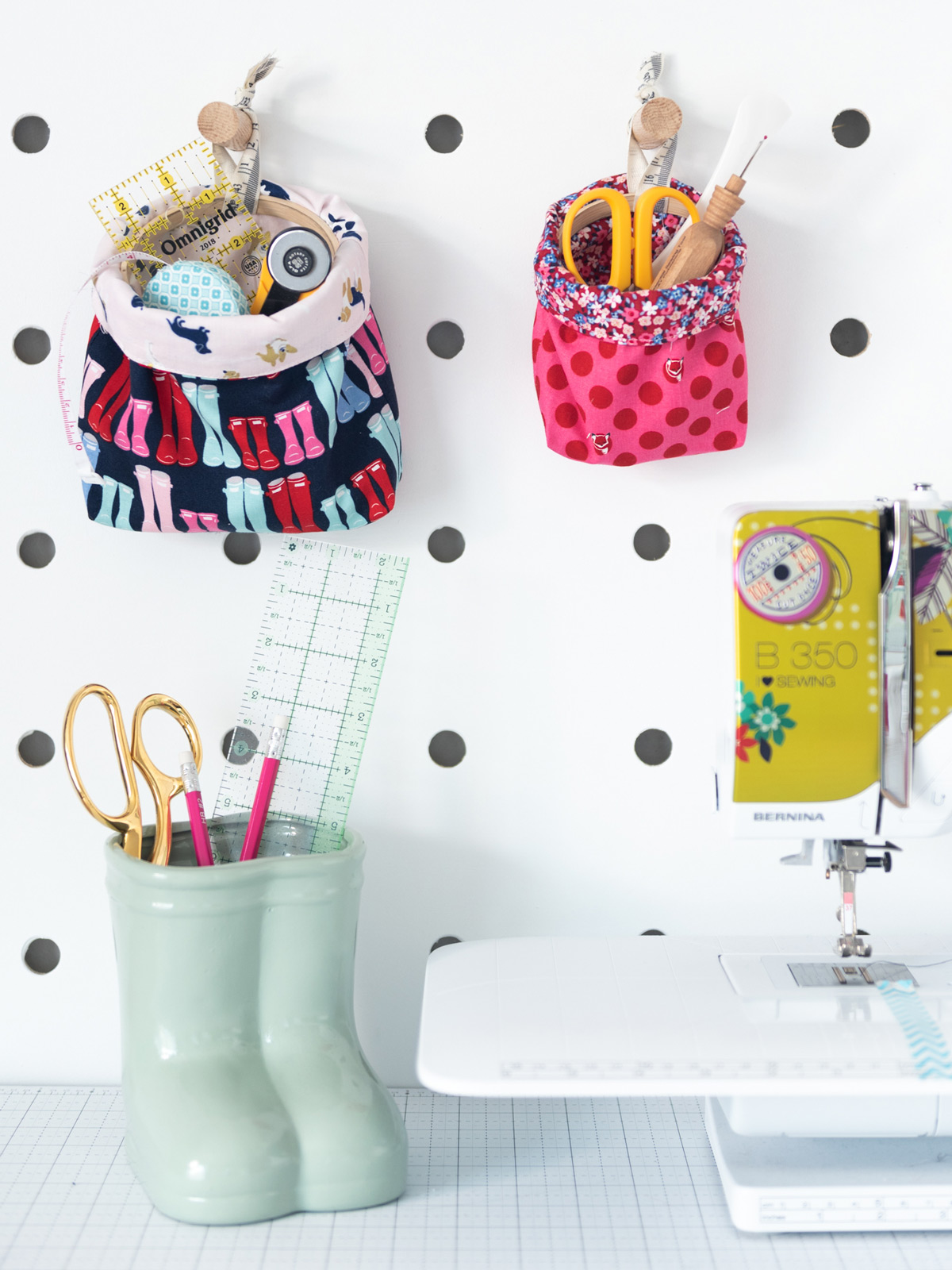She writes, "I’m always losing my scissors and seam rippers while I’m sewing and thought it would be nice to have a small hanging basket to store them. I liked how my basket turned out so much that I made two of them. I’m going to show you how to make the smaller of the two baskets today and will include the pattern sizes needed to make the larger basket as well. These baskets are just the right size to hang on a pegboard to store small accessories."