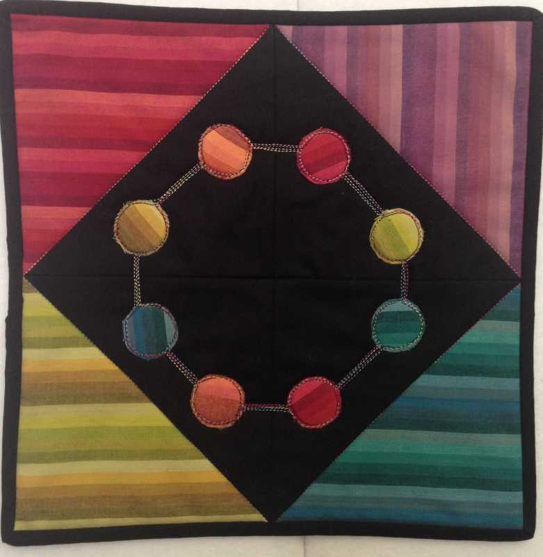 My mini quilt group decided to learn new techniques this year and each of us was to provide a small project. I finished one last week. It was supposed to be bubbles,, made with a lace overlay with lots of silks, satins, and other fabrics. Well, I didn't have any lace or netting and I really didn't like the look of the intended piece. So I used up some scraps from a quilt I made for our front guest room. This is what I came up with. I kinda like it!