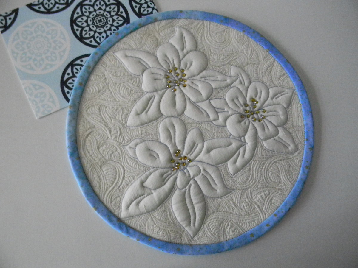 All week I have been in a class of moderately handicapped students. Very long and sometimes stressful week. Anyway, today during art class we learned about "pop art". After seeing the art--I have to say that what we are doing here is definitely art--hold your heads high ladies! So, I left work today--glad to be done for the week; picked up my paycheck and found out I received a raise--woohoo! Now I make a little more than minimum wage. And, came home to find a mug rug--I am a happy girl.