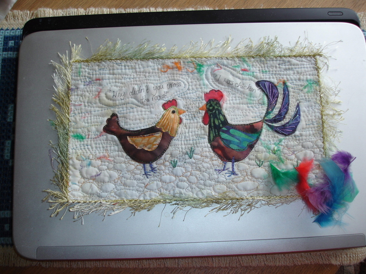 Charae is trying to convert me from Single Malt to Wine. Not a problem. I even have a suitable glass (Swedish!) for that lovely 'boozy' mug rug, and there is a bottle of Chateauneuf du Pape in the cupboard. The mug rug even came little decorative rings to put around the stems of your glasses, so that you always know which one is yours when the party is in full swing. Thank you very much, Charae. I'll treasure and use it!