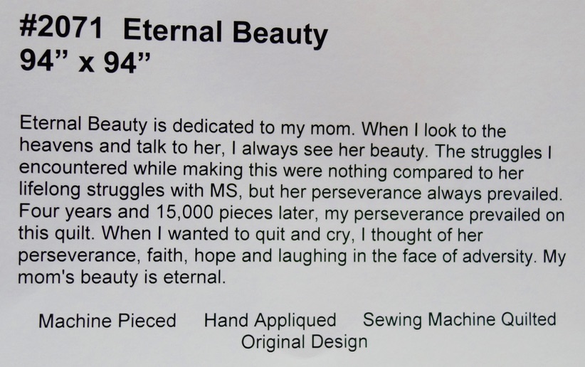Sherry Reynold's quilt, Eternal Beauty, won Best of Show at PIQF 2017 and is dedicated to her mother. We think the beauty of the quilt is eternal as well.